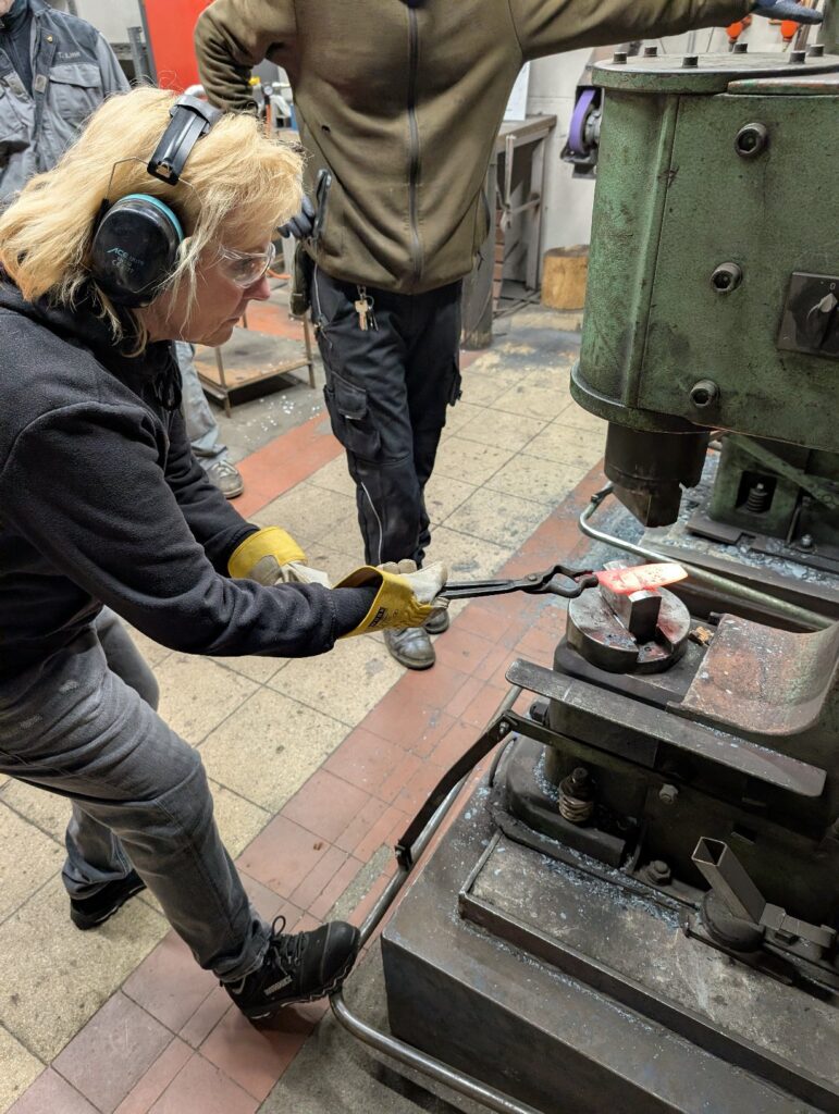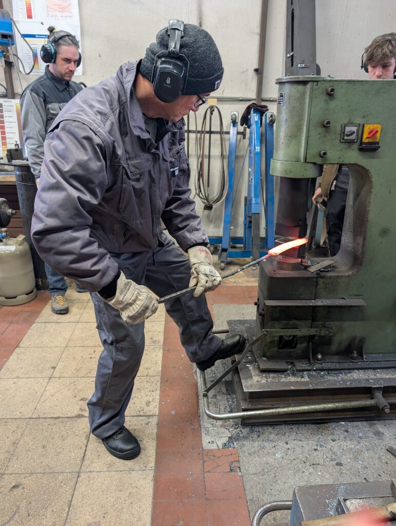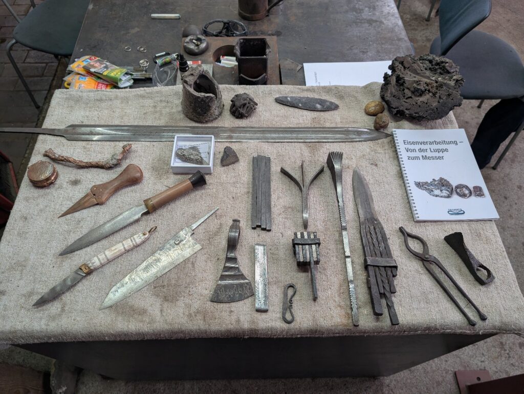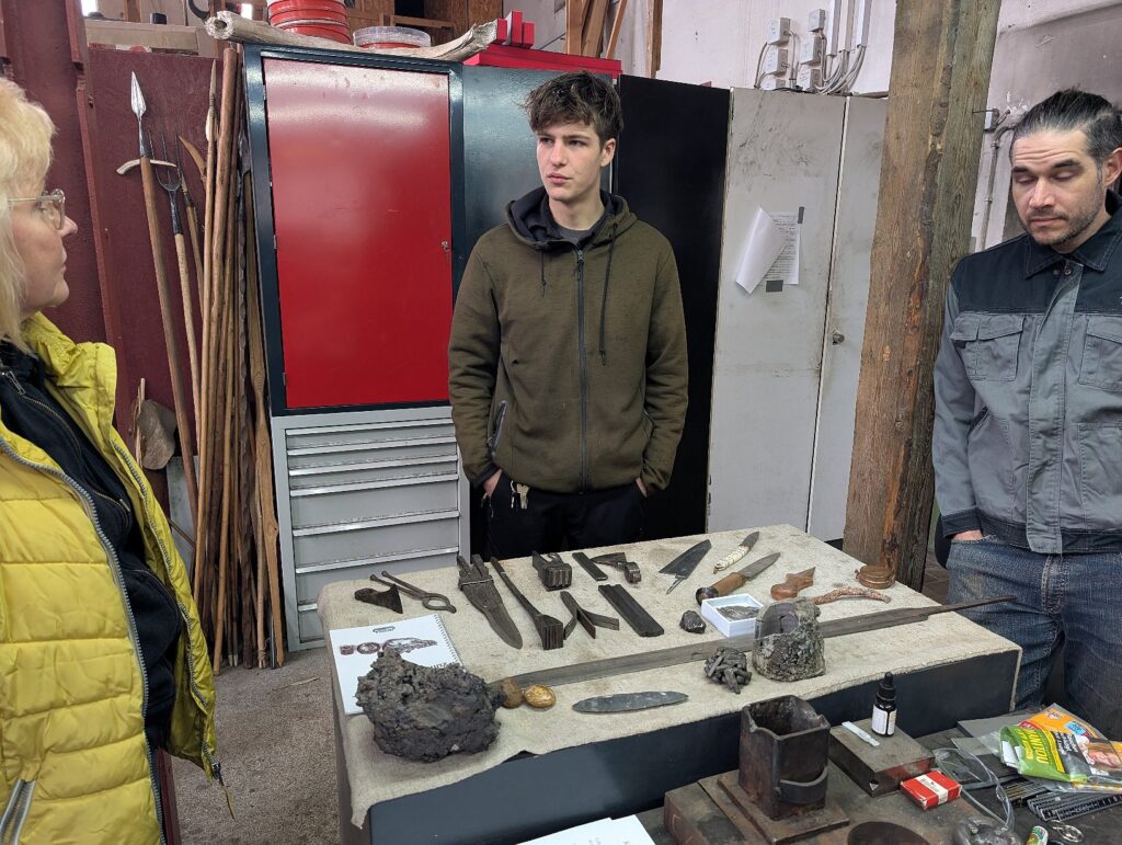 … der sehr junge Schmied mit unglaublich viel Wissen (Chemie, Werkstoffkunde, Geschichte der Eisengewinnung…) nahm es gelassen. Ein paar Engpässe bei der Werkstückbearbeitung gab es schon, aber letztendlich konnten alle ganz gut damit leben.