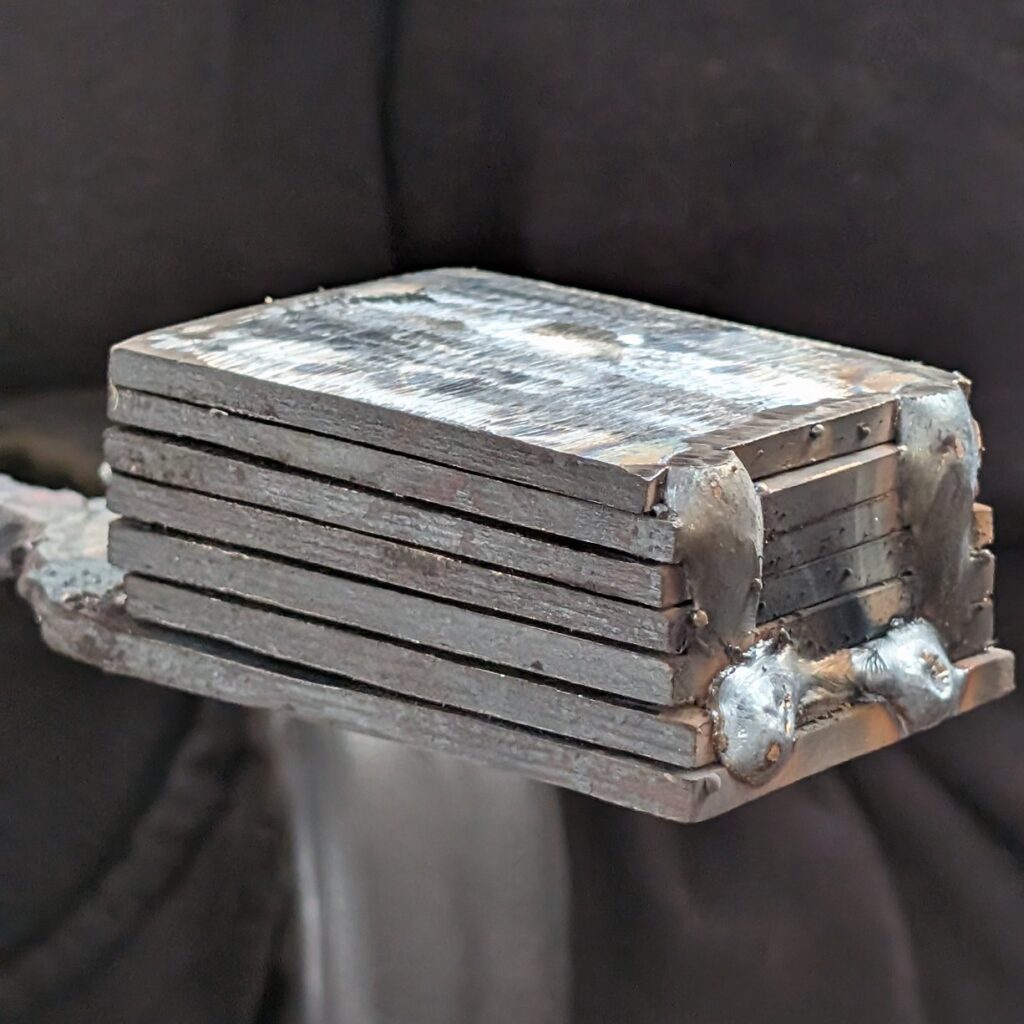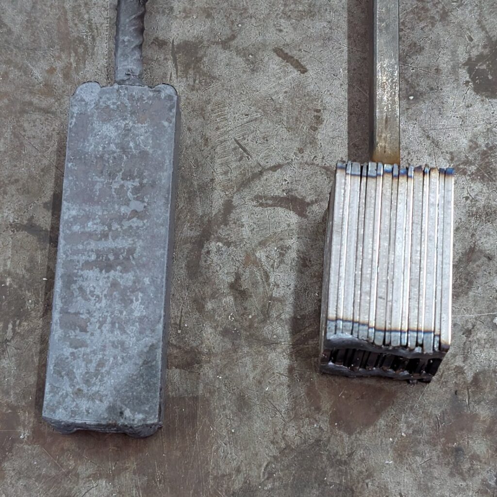 Ein Block aus 15 Lagen Stahl (rechts im Bild) für je 2 Personen wurde schon für uns vorbereitet und zu einem massiven Klotz feuerverschweißt (links im Bild).