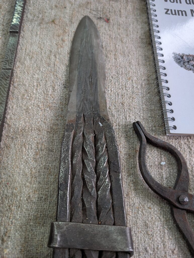 Wie wir weiter erfahren, hat das Falten und wiederholte Feuerverschweisen des Stahls weniger mit dem Aussehen, als historisch bedingt mit dem „Austreiben“ von Verunreinigungen aus den Eisenklumpen (Luppen, rechts oben) zu tun. Erst als die so hergestellten Messer und Schwerter zu Statussymbolen wurden, hat man auch mit den optischen Linien der Schichten experimentiert und diese als Gestaltungselemente eingesetzt.