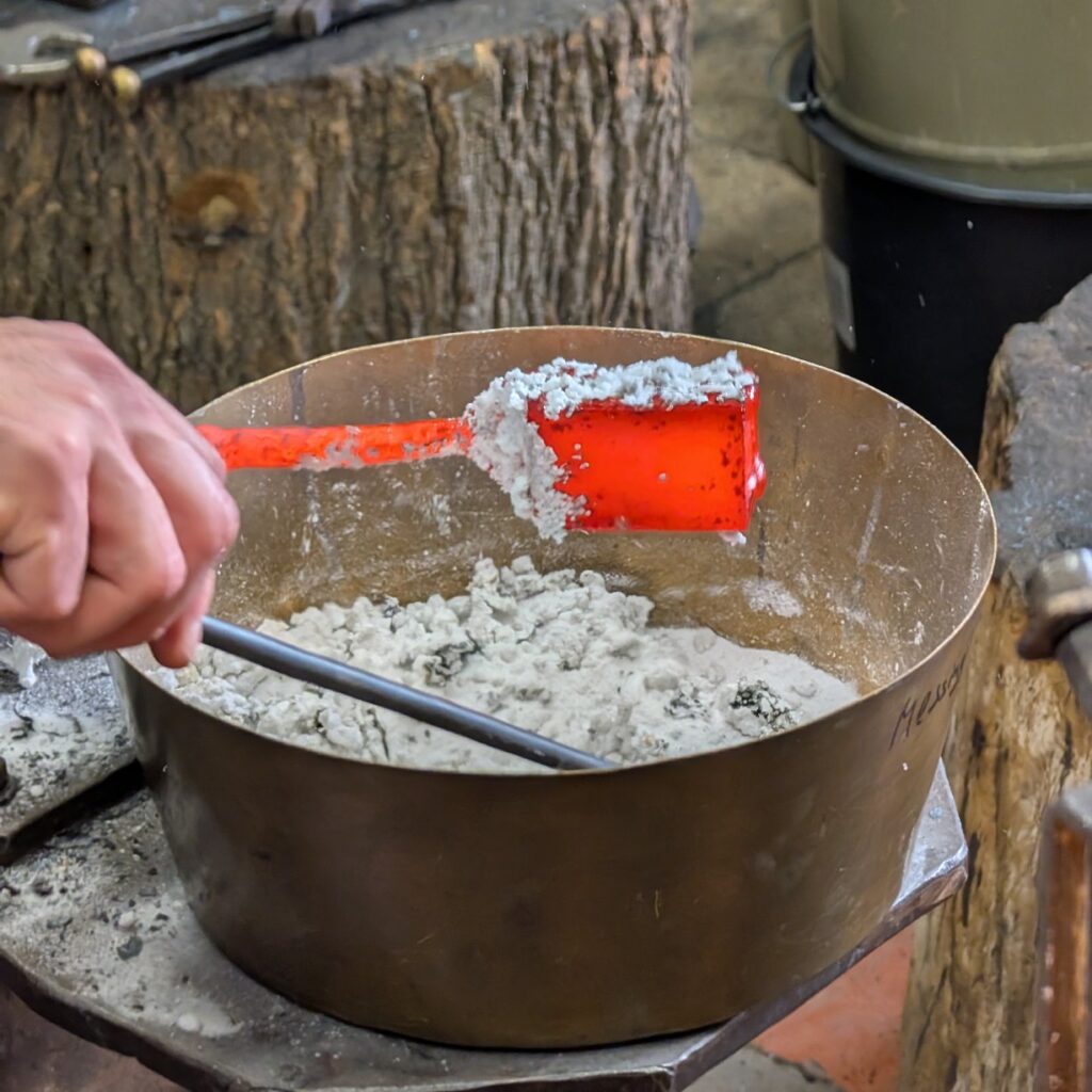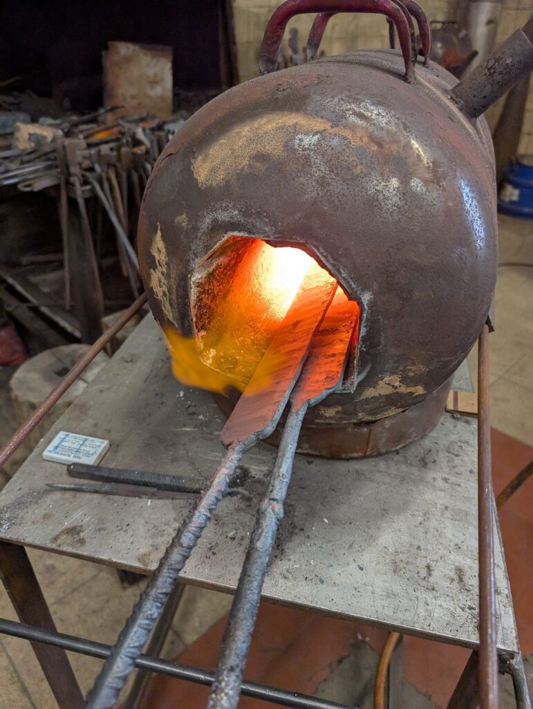 1) Normalisieren: der durch das Schmieden „gestresste“ Stahl wird auf 900 Grad in der Esse (Gasofen) erhitzt, danach langsam an der Luft abgekühlt und soll sich dadurch entspannen.