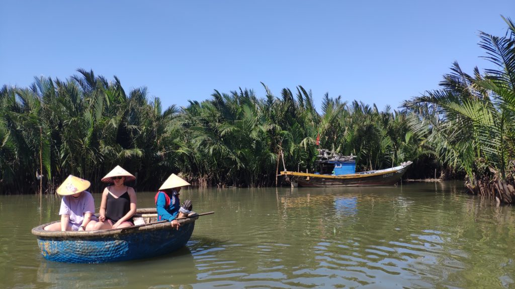 Nach dem selbst zubereiteten Mittagessen wurden wir zur Fahrt mit dem runden Korbboot abgeholt. Gerudert wird hier ganz vorn. Das verhindert, dass sich das Boot nur um die eigene Achse dreht.