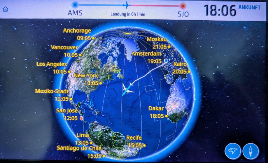 Letztendlich aber doch in SJO San José angekommen. Insgesamt waren es ca. 20h Reisezeit: Stuttgart Check-in 7:45, 9:45 Abflug nach Amsterdam, 13:40 Weiterflug mit ca. 12h Flugzeit von AMS nach SJO. Kurz vor 19 Uhr endlich an ein freies Gate in San José angedockt, nachdem wir eine Dreiviertelstunde auf dem Vorfeld rumgestanden haben. 20 Uhr habe ich dann endlich meinen Koffer in den Händen. Eine freundliche Dame von Ara-Tours hat am Flughafenausgang auf mich gewartet, mir noch ein paar Reiseunterlagen, sowie eine schöne Aluminium-Wasserflasche und einen Steckdosenadapter übergeben und mich dann zu einem Fahrer ins Auto gesetzt. Gegen 20:45 war ich dann im Hotel (3:45 Uhr dt. Zeit). Der Geldautomat um die Ecke hat leider nicht funktioniert. So muss das Eindecken mit Bargeld bis morgen warten.