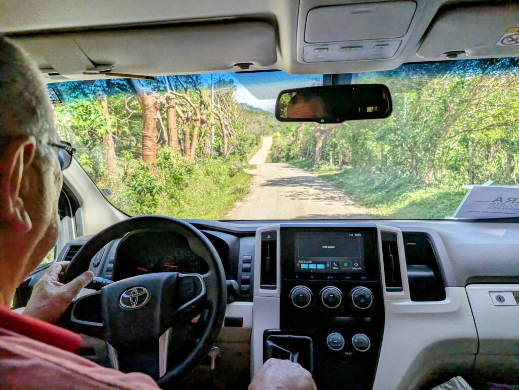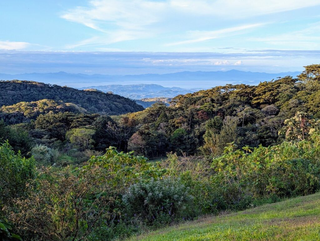 Dann geht es noch einmal ein Stück die Piste entlang und eine Viertelstunde später erreichen wir unser Hotel in Monteverde. Die Zimmer sind groß, im Bungalowstil und mit Blick in die Berge vom großen Balkon. Im Hintergrund kann man sogar den Pazifik erkennen: