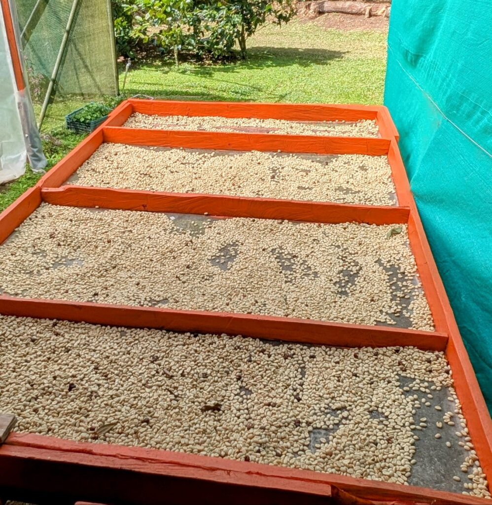 Die Kaffeekirschen werden hier erst manuell! geerntet, wenn sie wirklich reif (rot) sind und nicht gemischt reif/unreif, wie bei der maschinellen Ernte. Dann werden die Kerne (Bohnen) mit einer Handmühle vom Fruchtfleisch getrennt, …