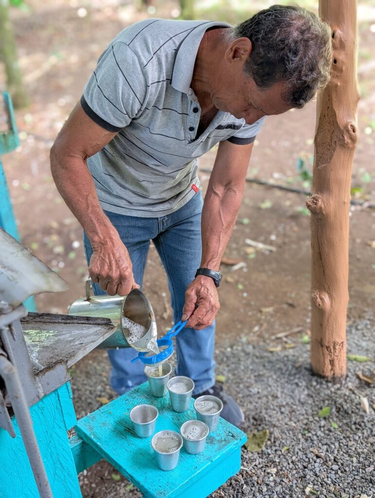 Er zeigt uns die verschiedenen Pflanzen auf der Farm und erklärt die bei ihnen praktizierte Kaffeeherstellung. Pflanzenschutzmittel verwenden sie keine und haben u.a. auch deshalb aktuell mit einem Pilz zu kämpfen. Die Kaffeepflanzen tragen ab ca. dem dritten Jahr Früchte und werden bis zu 25 Jahren verwendet. In dieser Zeit werden sie mehrmals in Kniehöhe komplett gekappt und treiben seitlich neu aus. Siehe Foto: