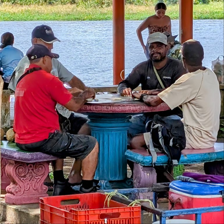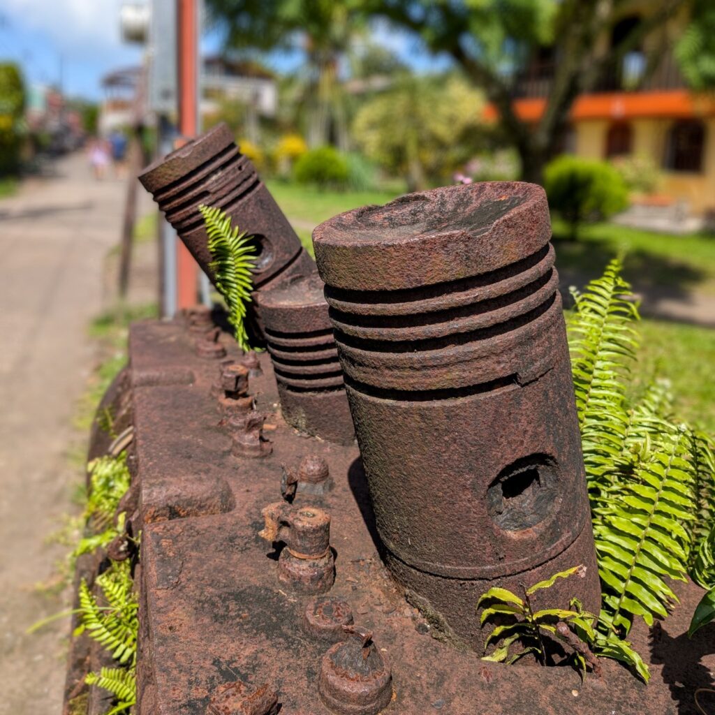 Im Dorf findet man noch einige verrostete Maschinenteile und Motoren, die als eine Art Denkmal stehen gelassen wurden, um an die Zeit zu erinnern, als hier eine ausländische Firma Raubbau an den tropischen Hölzern begangen hat.