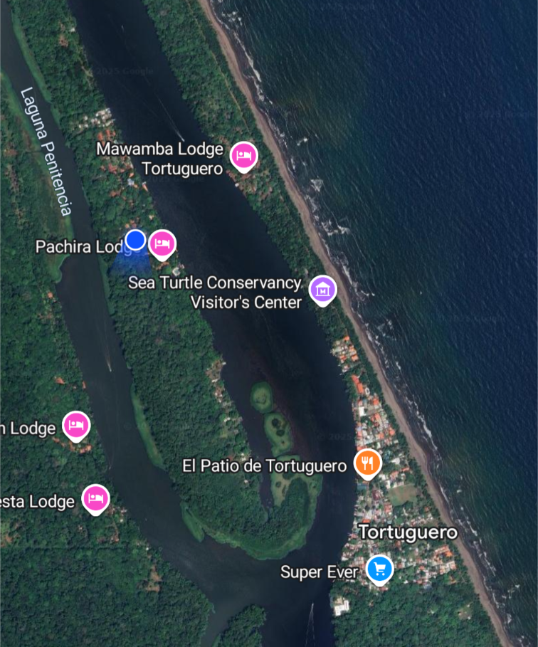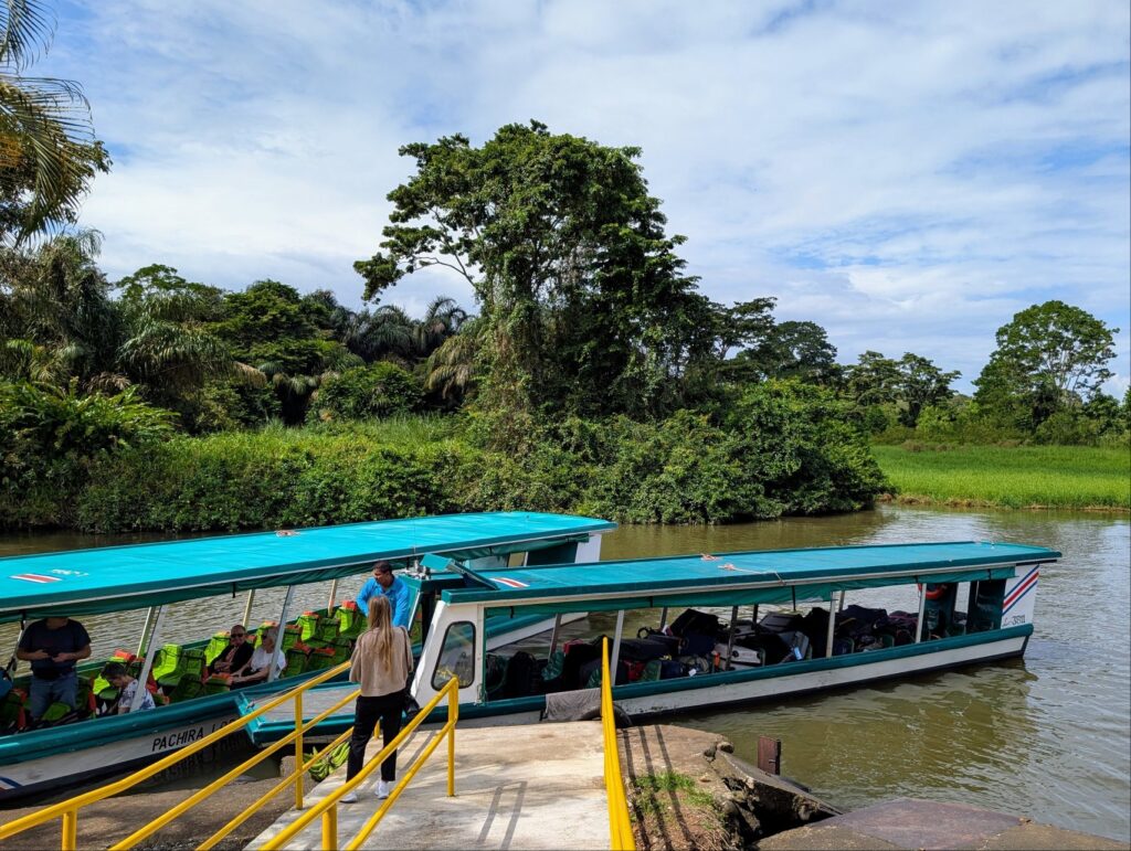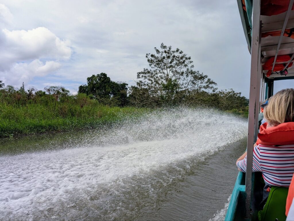 Dann geht es rein in die „senderos acuáticos“ – ein System von Wasserwegen, Flüssen, Kanälen im Nationalpark. Mit bis zu 40 km/h fahren wir anderthalb Stunden Richtung NNW nach Tortuguero. Das Dorf ist nur mit Boot oder Flugzeug erreichbar.
