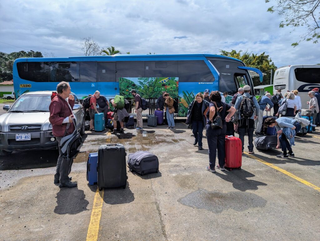 Noch vor dem Frühstück, 6:50 Uhr, starten wir gen Norden. Nachts hat es etwas geregnet und die Straßen sind naß. Gegen halb 9 stoppen wir an einem größeren Restaurant für das Frühstück. Hier müssen wir auch in einen großen Bus mit ca. 30 fein gekleideten amerikanischen Touristen umsteigen, die uns nur widerwillig Platz machen. Unterwegs „besuchen“ wir noch eine Bananenplantage. D.h. der Busfahrer fährt für eine Minute sehr langsam an einem Platz vorbei, wo Bananen exportfertig gemacht werden. Quasi ein Plantagenbesuch-Drive-Thru a la americana🤣